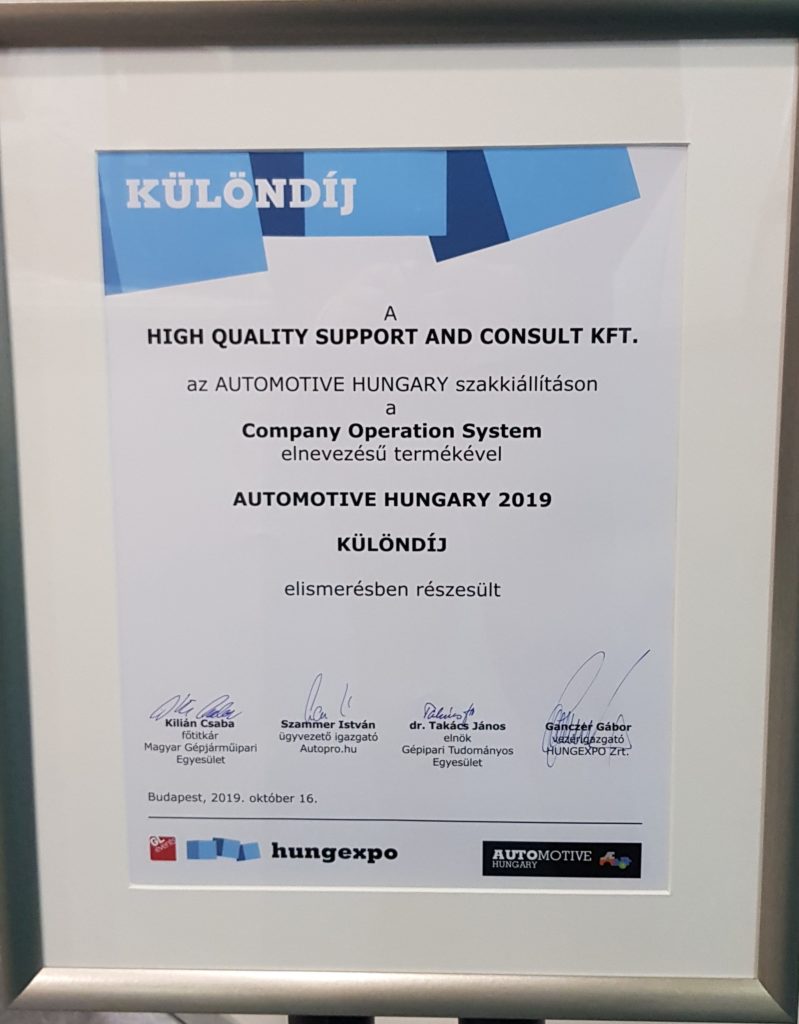 Büszkeséggel tölt el bennünket, hogy az Automotive Hungary 2019 kiállításon a Company Operation System (COS) szoftverünket különdíjjal tüntették ki.